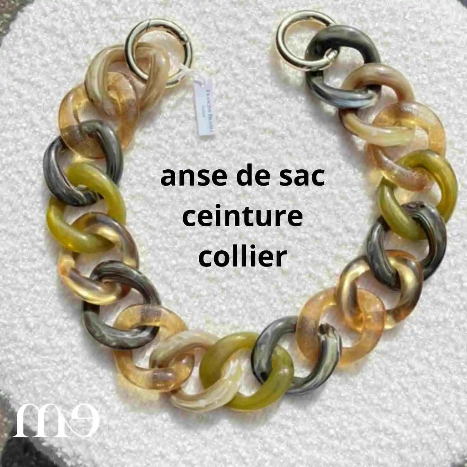Avec ses fermoirs dorés cette pièce peut être portée soit comme ceinture, anse de sac ou collier.