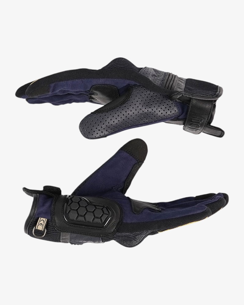 Gants en cuir et maille aérée avec protections Flexishock sur les articulations et renforts anti-abrasion sur la paume. Fonction tactile sur l’index et le majeur, ajustement velcro au poignet.