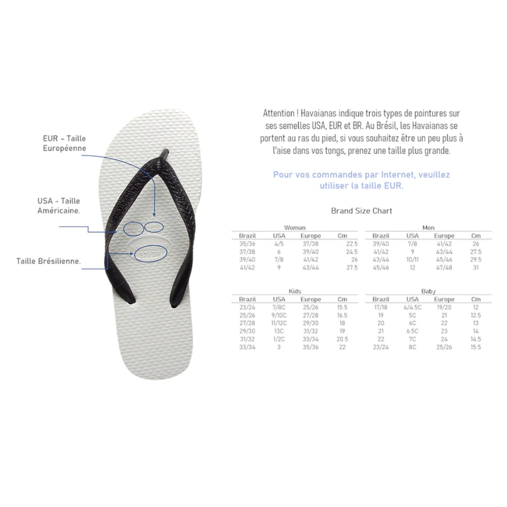 ATTENTION, nous vendons les tongs Havaianas en tailles BRÉSILIENNES. Veuillez-vous référez à la grille des tailles ci-dessous: