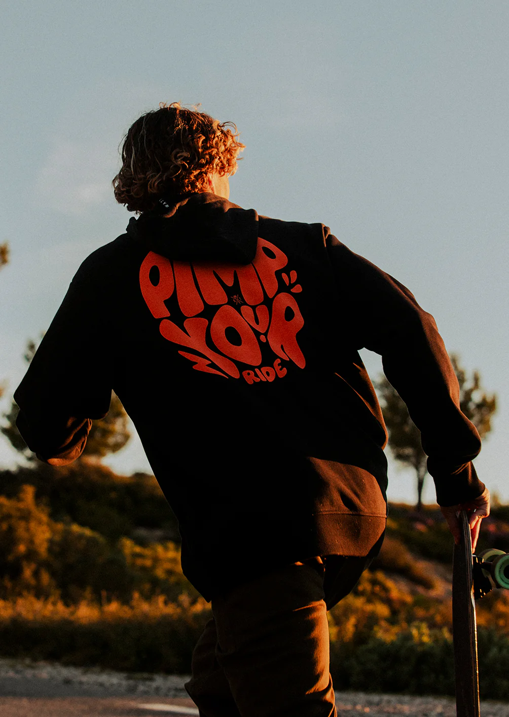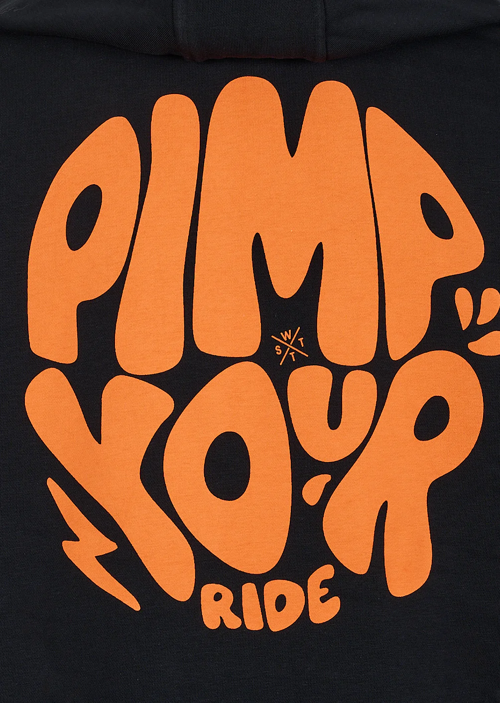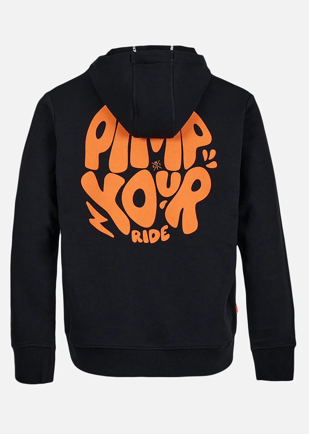 Au dos, le grand motif « PIMP YOUR RIDE » en orange fluo affirme l’ADN street et le parti pris graphique du hoodie, avec un rendu visuel percutant à chaque mouvement.