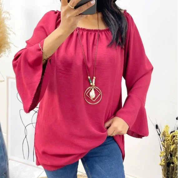 Les manches 3/4 apportent une touche de sophistication à l’ensemble, pour un look à la fois élégant et décontracté. Pour parfaire votre style, un collier tendance est offert avec la tunique. Ce bijou délicat saura sublimer votre décolleté et ajouter une touche raffinée à votre tenue.